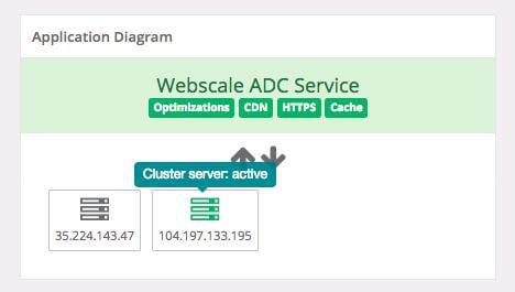 | On the application page, the Application Diagram section shows the currently active servers, as well as any servers currently scaling in or out. A list of the IP address for each server is below the server icon. Hover your mouse over the server icon for additional info. | |