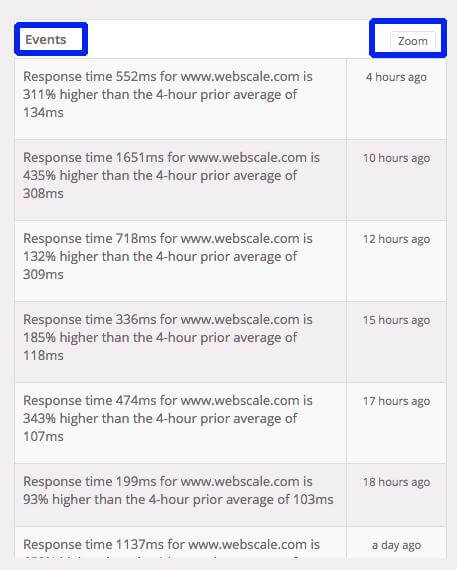 | The Events section shows a running log of all events, including scaling in and scaling out events. Click the Zoom button for more details and calendar options. |