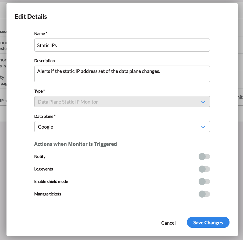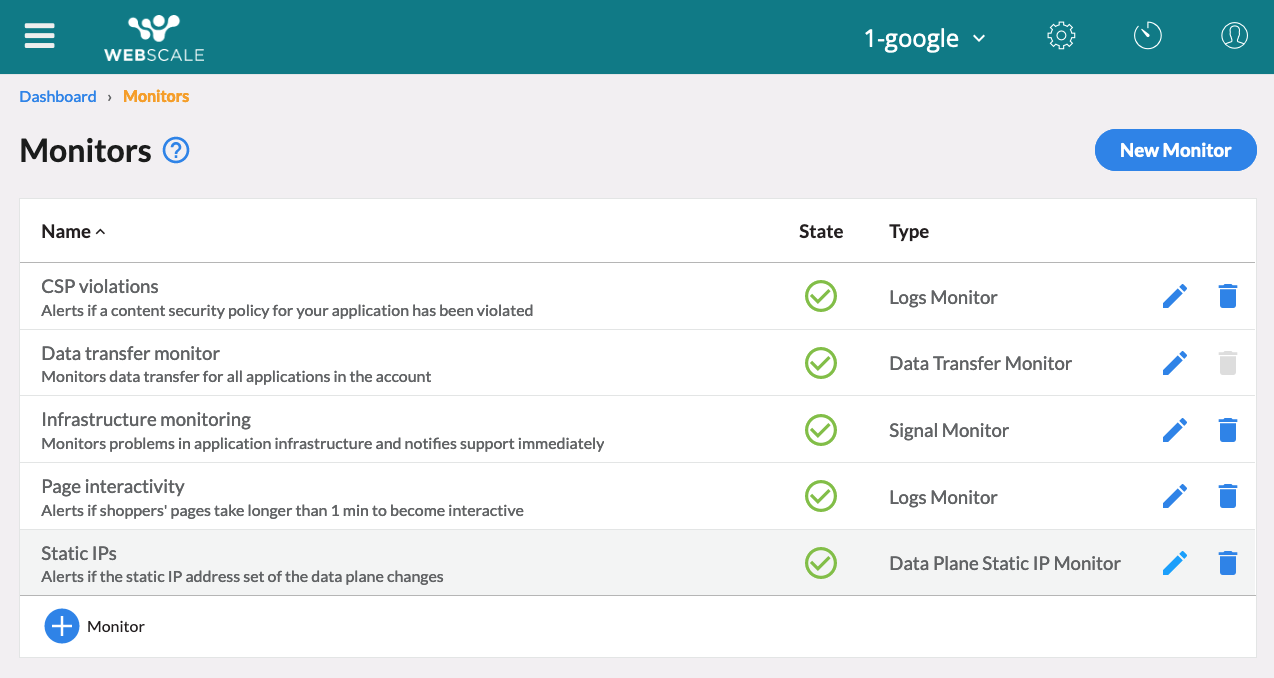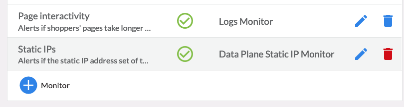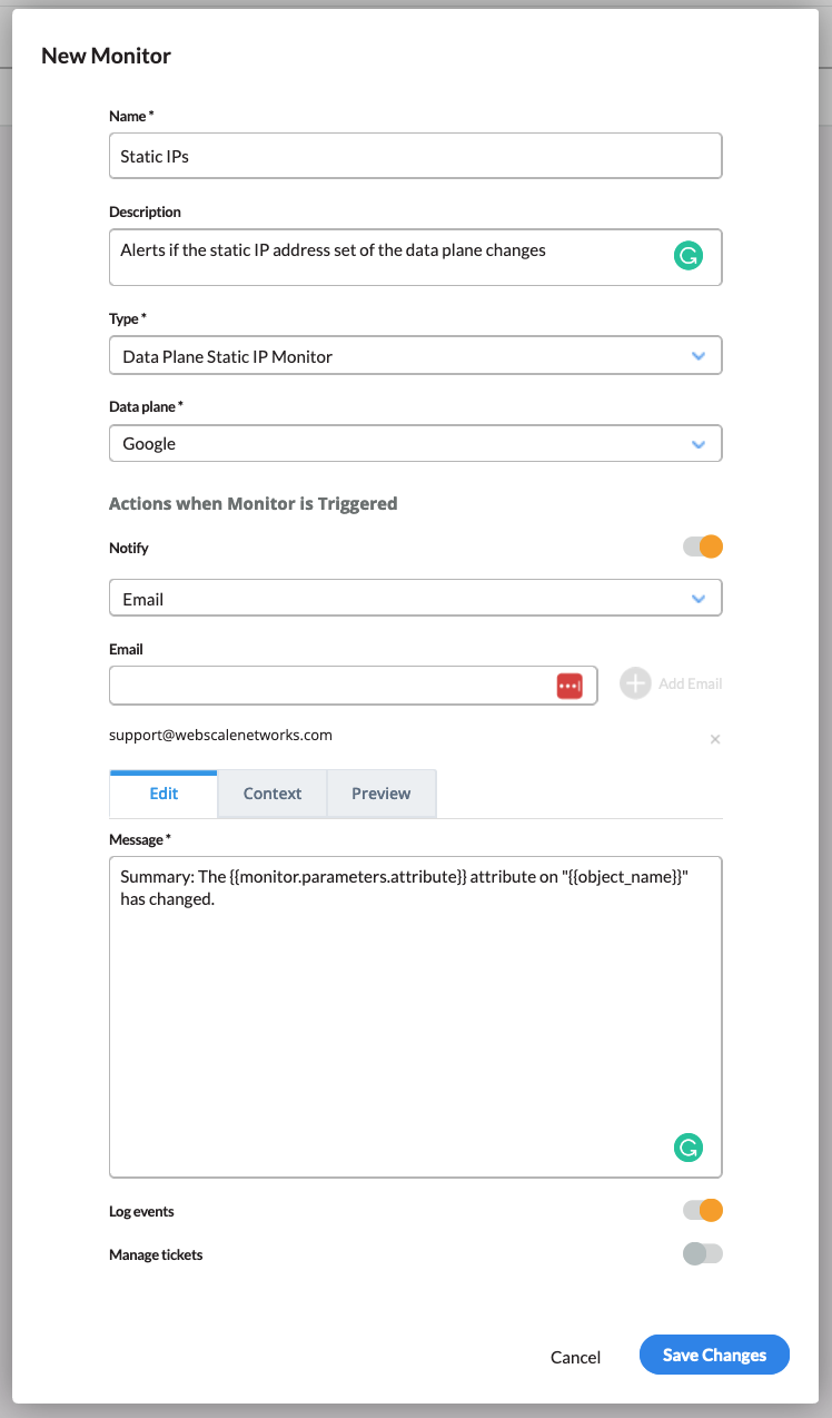You can create monitors and choose the static_ips attribute for data planes that do not have the static IP addressing feature enabled. These monitors track changes to this attribute for specified data planes. If you enable this feature for an existing data plane, Webscale will add the data plane’s existing IP addresses to its static IP address pool. The monitor will register the change. If you have entered an email address or VictorOps information, Webscale will then send a notification.