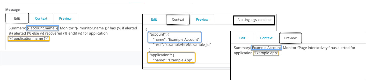 The above graphic illustrates how you can compose two sentences of a message, using variables from the Context tab. The Preview tab displays how they will render. The Alerting logs condition option menu selection determines that the message is an alert.