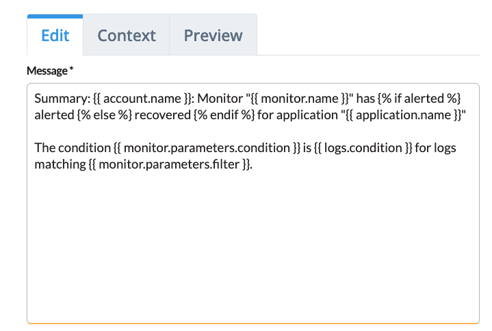 - Edit tab: Displays a sample message that demonstrates how to use the context variables. You can modify or replace this sample message.