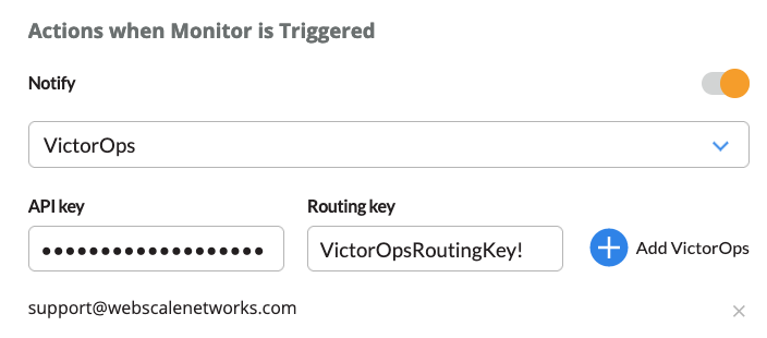 For the Notify setting, you can choose to send notifications to specified email address or to the Splunk On-Call third-party notification system if you have installed this product. (The former name for this system is VictorOps)Notification messages