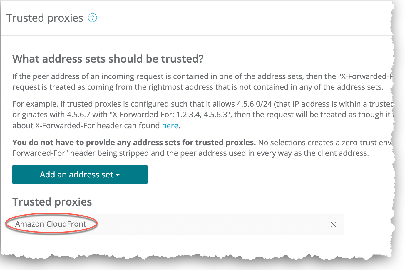If the peer address of an incoming request is contained in one of the address sets, then the X-Forwarded-For header is decoded so that the request is treated as coming from the rightmost address that is not contained in any of the address sets.