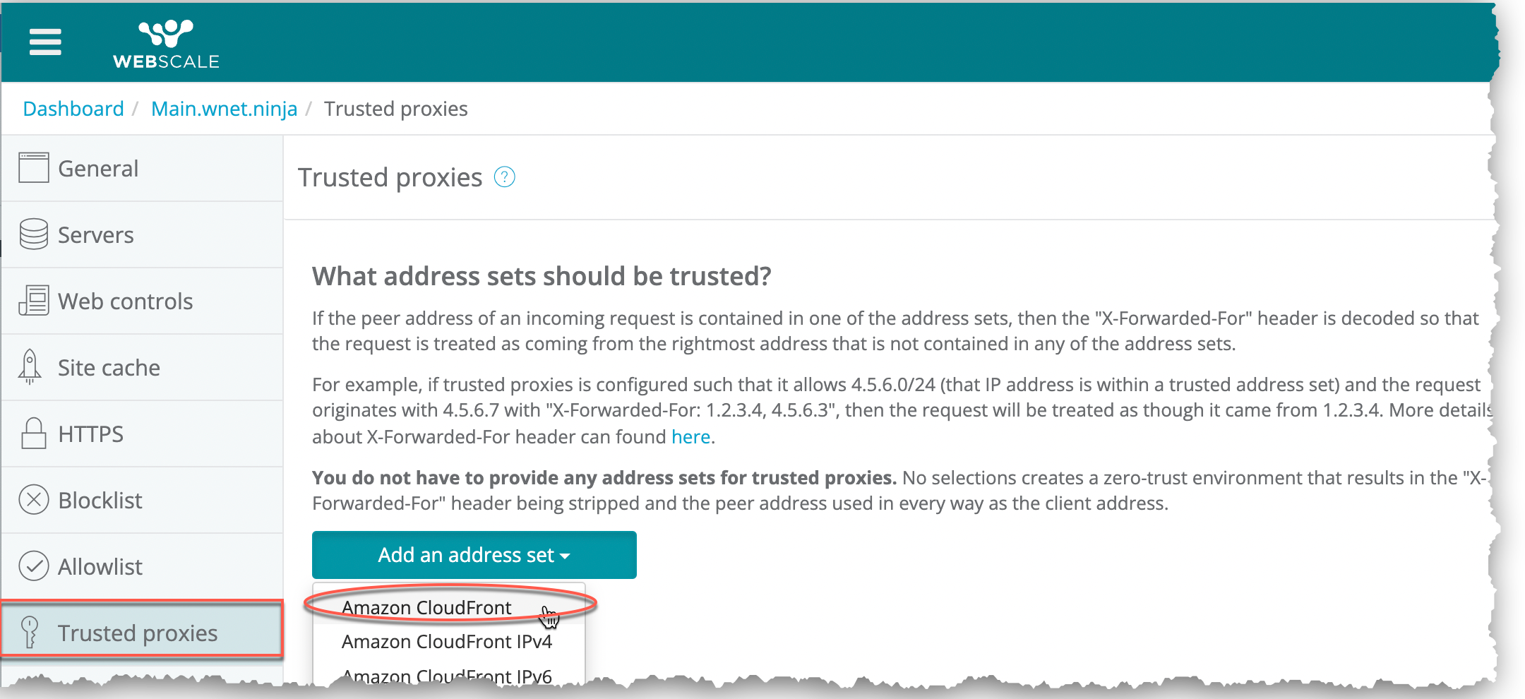 The Trusted Proxies feature enables you to designate proxy IP addresses for providers that you trust. You can add trusted proxies through the Webscale Control Panel. To use this feature, select address sets with provider IP addresses and choose to enable it.