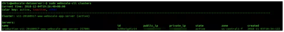 sudo webcscale-cli apps serversReturn the internal IP address of servers for the applications as defined in the config file,/etc/lagrange-credentials.ymlsudo webcscale-cli clusters: Your Webscale application clusters. To see the output of the clusters command, you need to expand your terminal window to 173 columns.