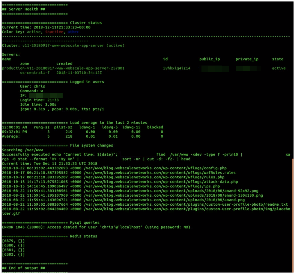 One of the most common uses of the Webscale CLI is to check the overall health of the cluster. This command shows information such as MySQL queries, recent file changes, and other details about the cluster and the database.