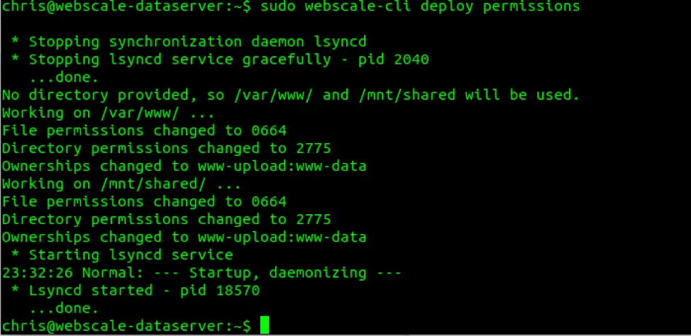 This subcommand of the webscale-cli command recurses through the /var/www/web_root and the /var/www/shared/ directories to make sure that all the files underneath these two directories have the proper ownership and permissions. It is usually run after any deployment to make sure things are as they should be.