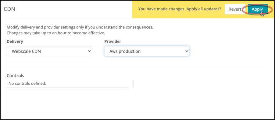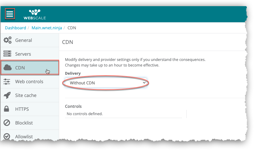 To roll back Webscale CDN, delete all CDN Controls on the CDN page. Doing so reinstates the default caching policy for Webscale CDN to not cache anything. Traffic still passes through Webscale CDN.