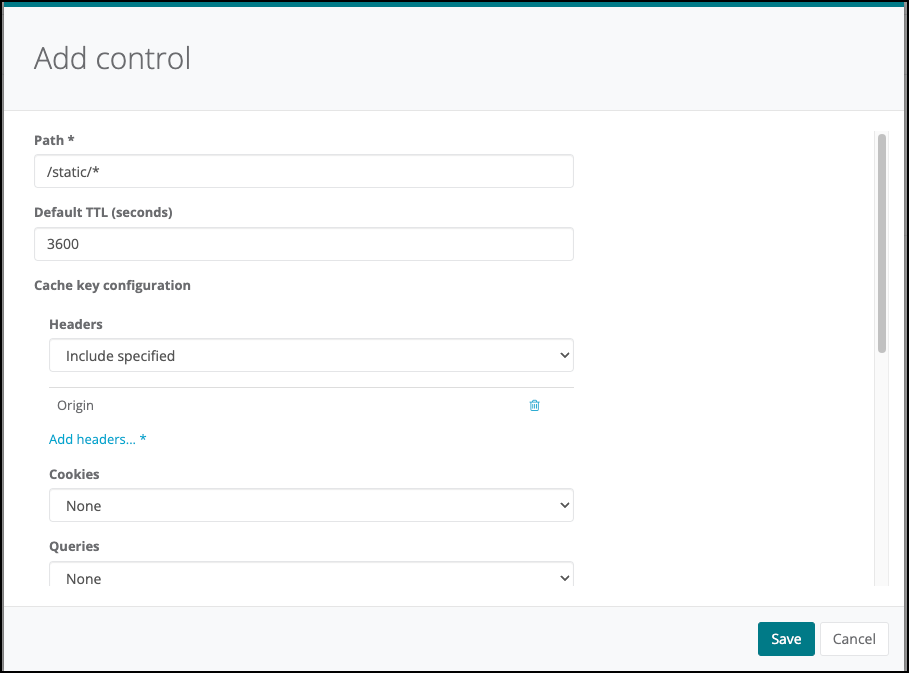 In the Add control dialog box, enter a path for the CDN control. Then, except for the CloudEDGE Workers settings, configure the desired optional settings.