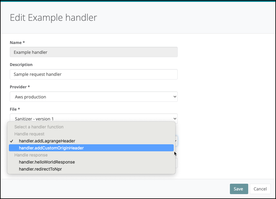 When you edit a handler that is associated with a CDN control, you can select a different function for the handler. However, you can only replace it with a function that has the same type (request or response) as the current selected function.