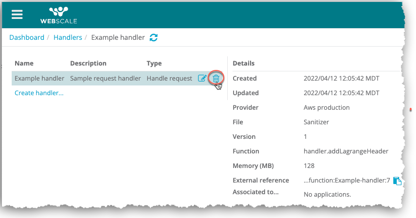 On the Handlers page, click the delete icon for a handler.