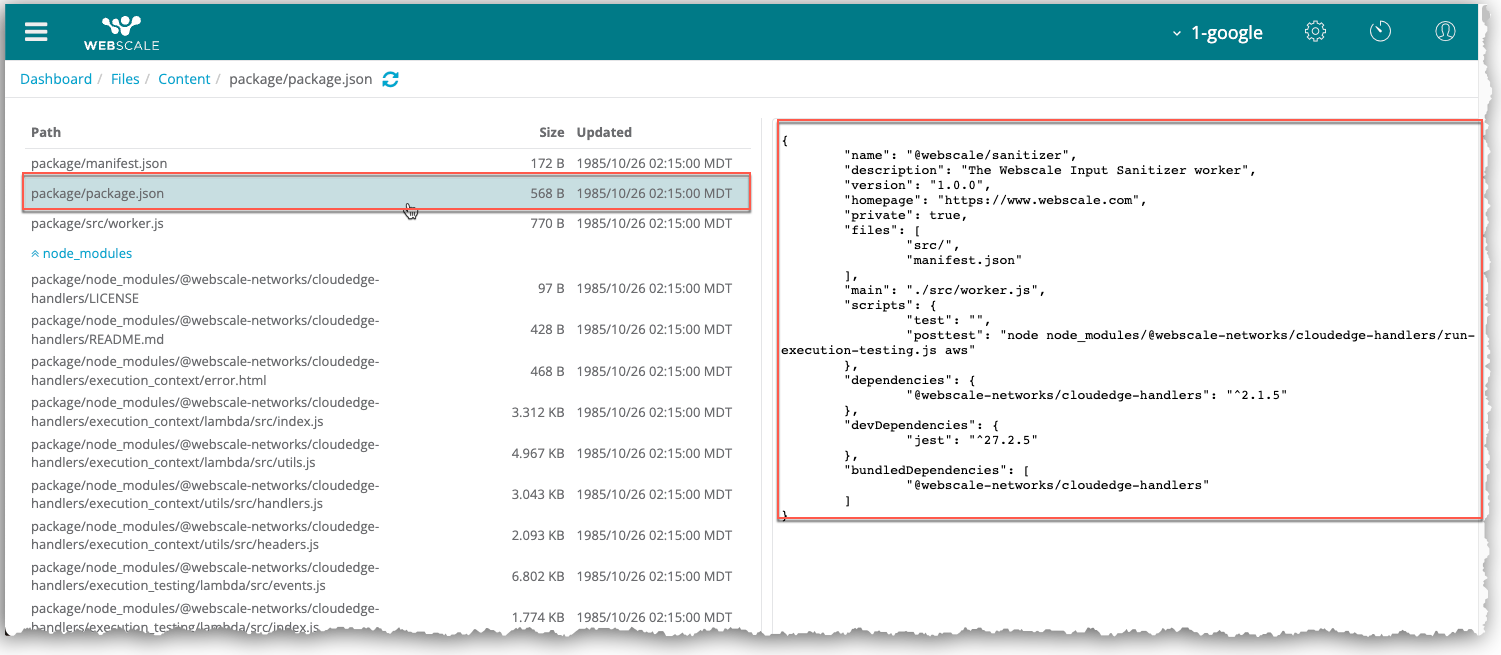 In addition, the handler package file (also known as a handler file) must include two files specific to Webscale: package.json and manifest.json. These files must exist in the root directory of the handler file.