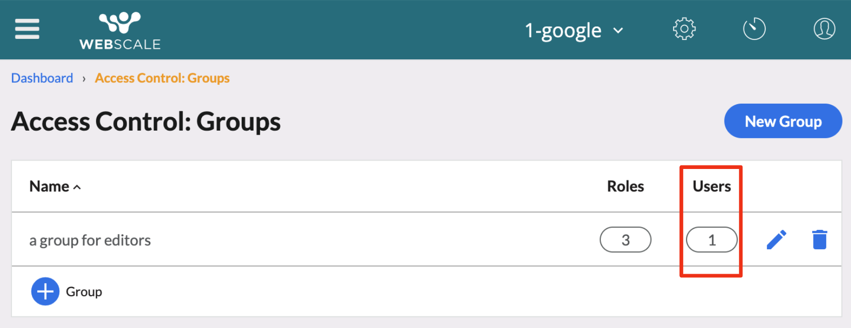 | 2. On this page you see existing groups. To invite a user to the group, click the Users button for the group, then click the pencil in the upper right of the expanded panel. | |