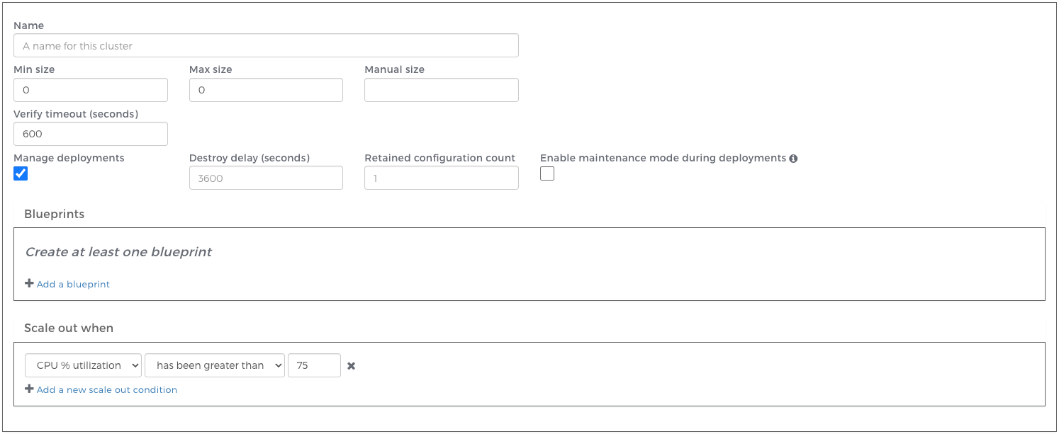 | Enable maintenance mode during deployments | When checked, any applications with the cluster assigned to them will enter maintenance mode during deployments. In the event of a deployment failure, the application(s) will remain in maintenance mode. |