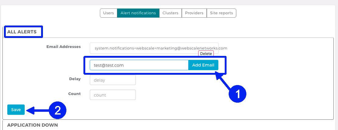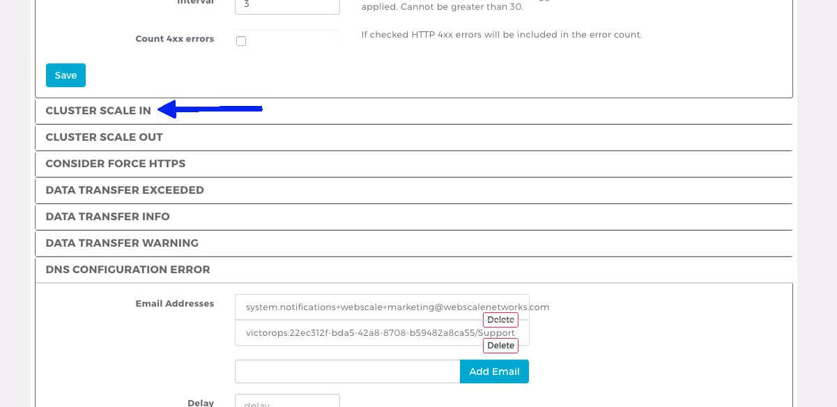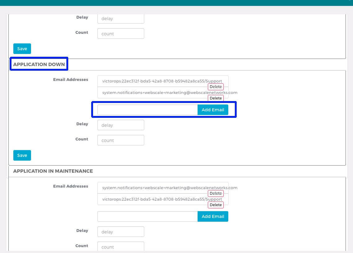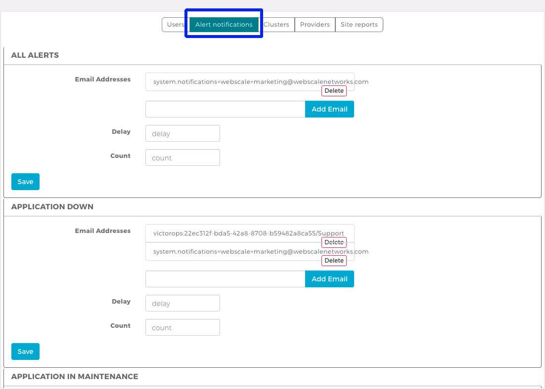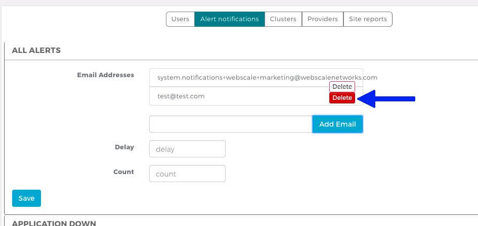 6. To disable alert notifications, click the Delete button for the email address you wish to remove from notifications. WarningYou should not delete anywebscalenetworks or victorops email addresses for any alerts as the Webscale support team uses these.
