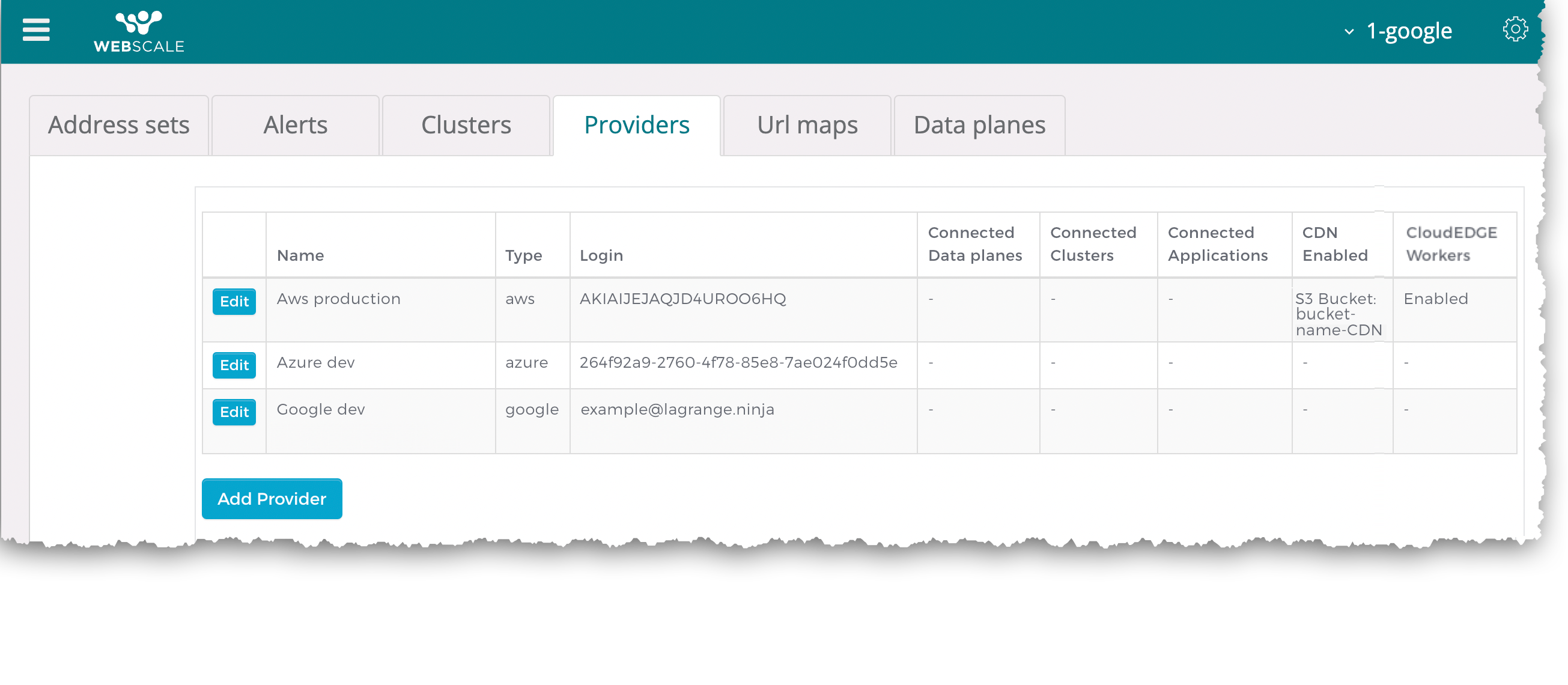 Editing a provider, which defines the relationship between your Webscale account and cloud service, can result in serious problems. Proceed with caution and contact support before editing a provider.To edit a provider
