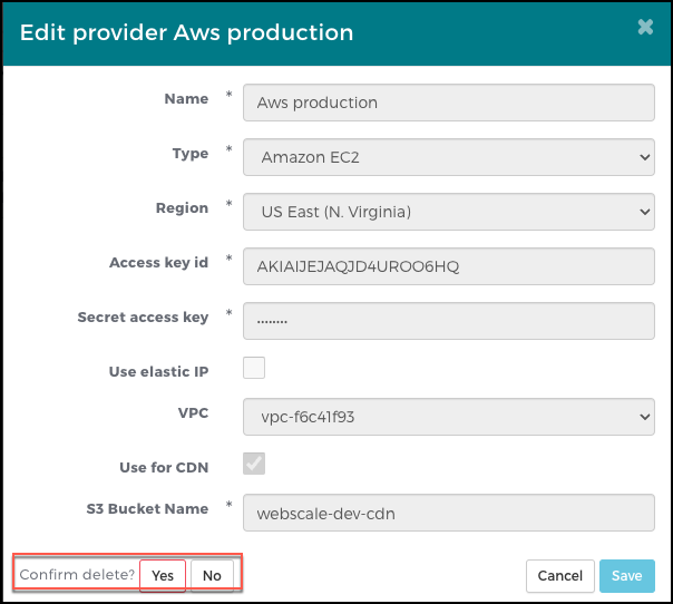 Deleting a provider, which defines the relationship between your Webscale account and cloud service, can result in serious problems. Proceed with caution and contact support before deleting a provider.To delete a provider
