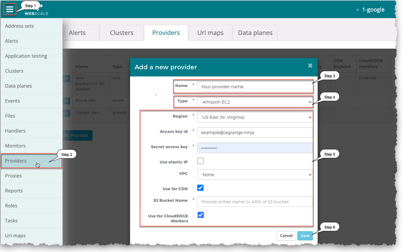 You can define providers for your account through the Webscale Control Panel. After you create a provider, you can use them in blueprints for data planes and clusters. You can also use providers to implement features such as Webscale CDN.