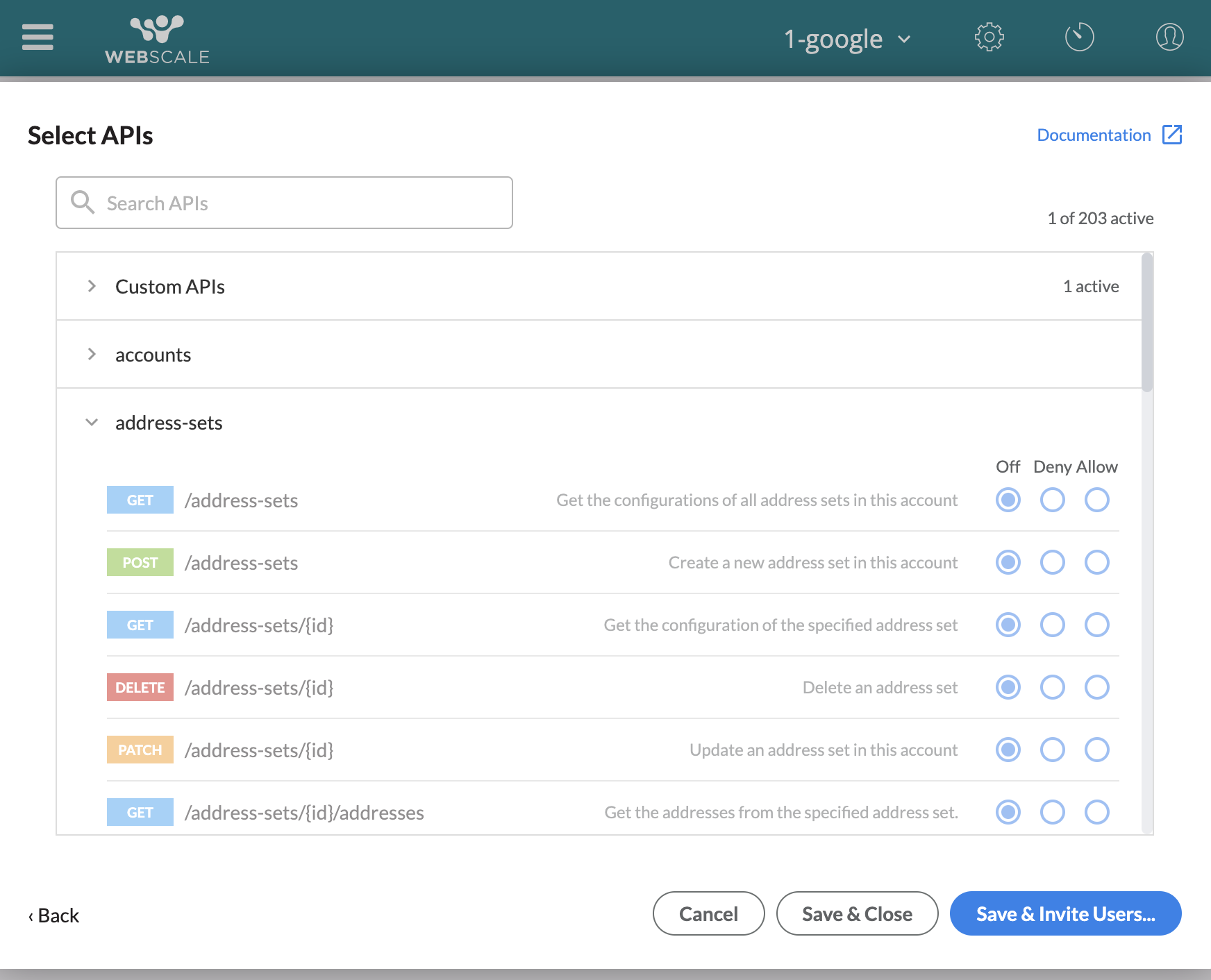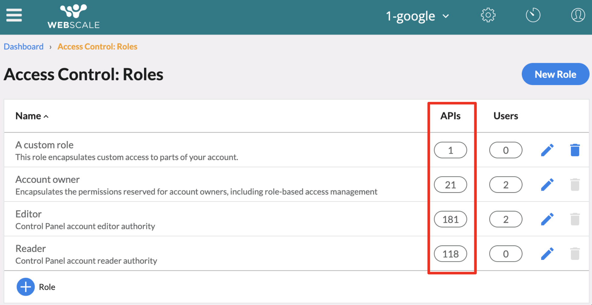 | 3. For Webscale API role-based access roles, clicking APIs lists the Webscale API access this role provides. | |