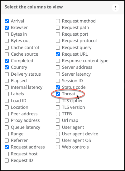 | You can configure Traffic Viewer to view threat requests from Traffic Viewer. For information on how to access Traffic Viewer for your application, see To access Traffic Viewer. To add the threat column