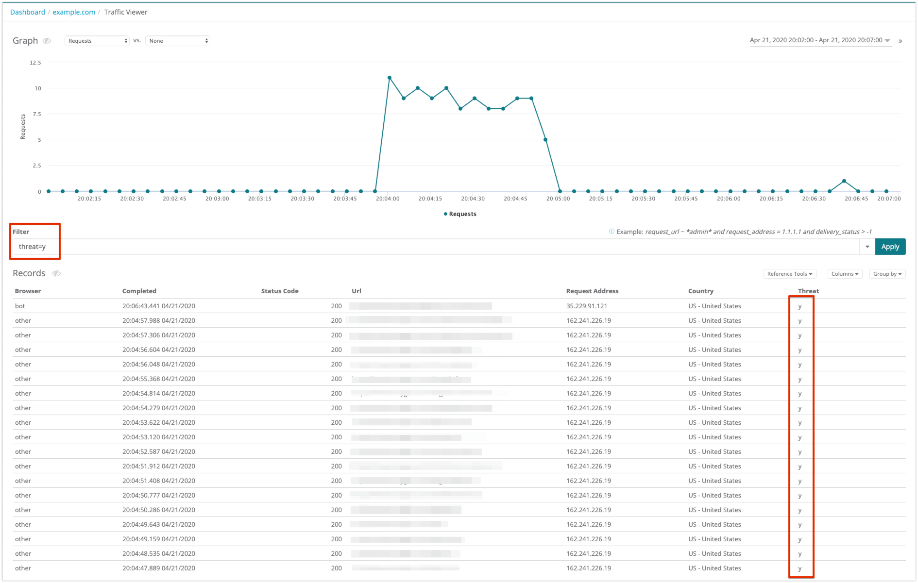 | You can filter traffic results to only display requests labeled as a threat. To filter traffic for only requests tagged as a threat