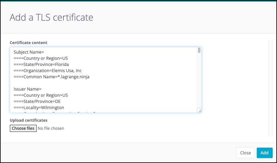 In the Certificate content box, paste the contents of your SSL certificate, key, and chain files. Or, click Choose files to upload the certificate, key, and chain files.