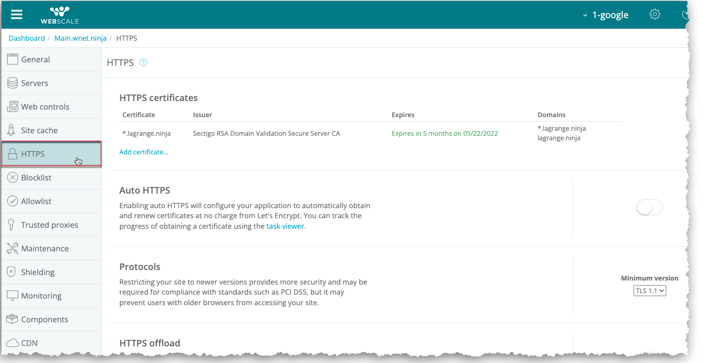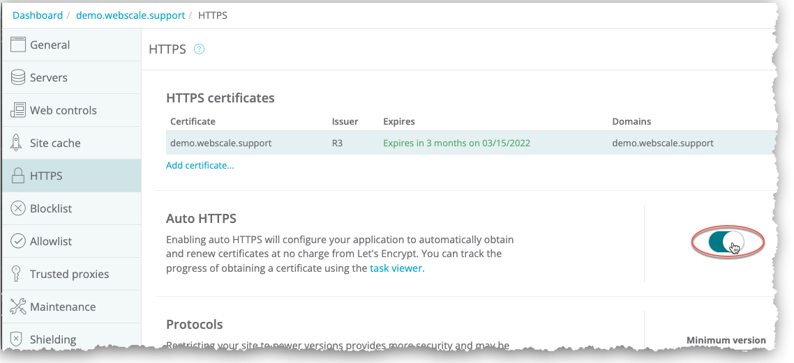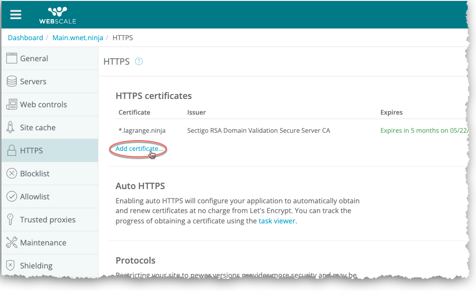 Through the HTTPS page for your application, you can install or upload your own certificate. Alternately, you can enable the Auto HTTPS feature, so Webscale automatically obtains, installs, and maintains Let’s Encrypt certificates for your site.