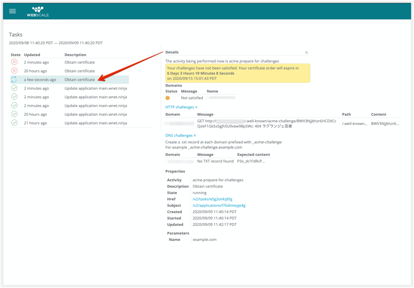 c. Click the Obtain certificate task to view information on the task status, certificate order, and HTTPS and DNS challenges.