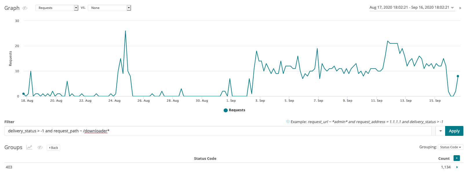As you can see, on about September 3rd there was an uptick in requests that match our query. Thankfully in this case the requests ended up with a 403 http response, which means the site was protected from this exploit.