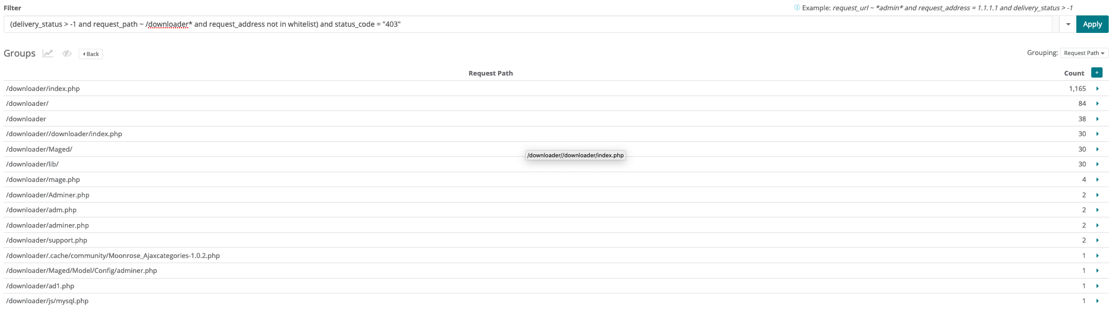 delivery_status > - 1 and request_path ~ /downloader* and request_address not in whitelist and status_code = "403"