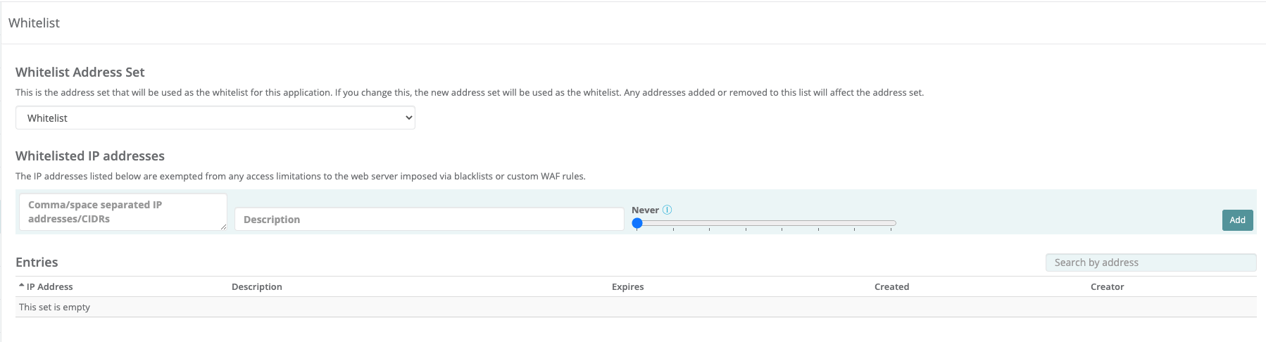 When you add an entry to the allowlist from either the Traffic Viewer, the CSP Logs Viewer or the Pageviews Logs Viewer, the entry will expire after 1 week by default. Note that the Add to allow list “Whitelist” item will only appear if the Allowlist is using either a Manual address set or a Combined address set that includes a manual set. If the option does not appear and you believe it should, you may have to reload the page.