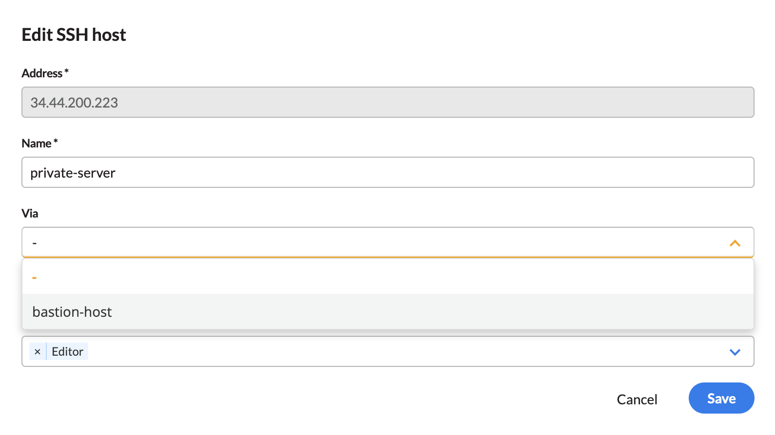 If the host is not publicly accessible, the bastion used to access the host must be a registered SSH host as well. Users can associate SSH hosts with their corresponding bastion by selecting the registered bastion in the “Via” dropdown in the SSH host management editor. The “Via” reference allows the SSH Connect facility to connect to a host by way of a different host.