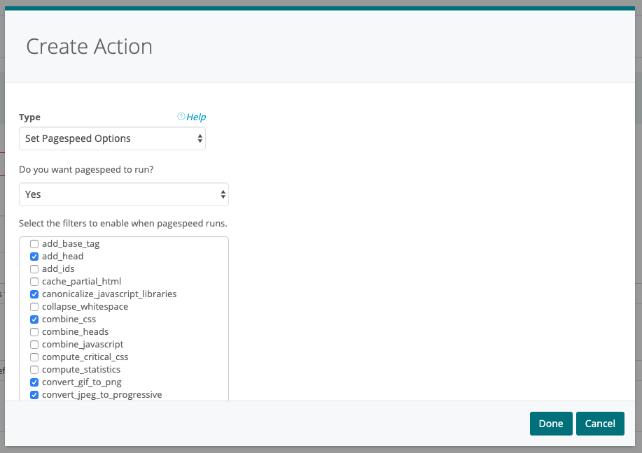 In the text area labeled Select the filters to enable when Pagespeed runs, choose from the list of Pagespeed options for this action to run. When finished, click the Done button to return to the Edit Web Control screen. You can add more than one action. Note that all actions specified are run, but there is no implied order.