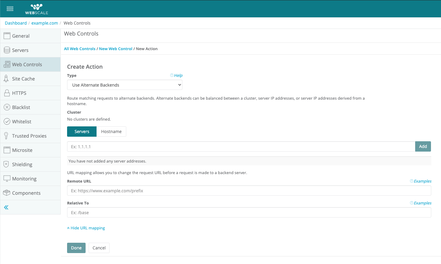 - Show URL Mapping - Click Show URL Mapping to set this option. URL mapping allows you to change the request URL before a request is made to a backend server. Choices are: